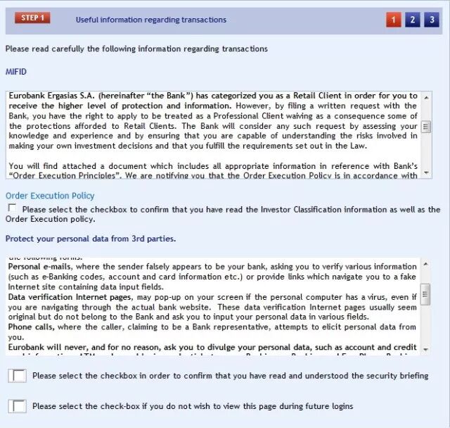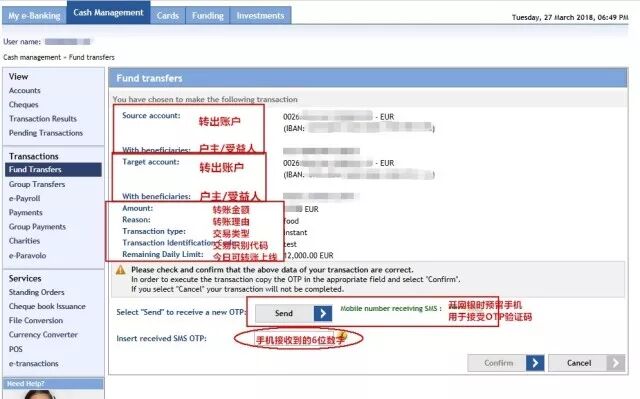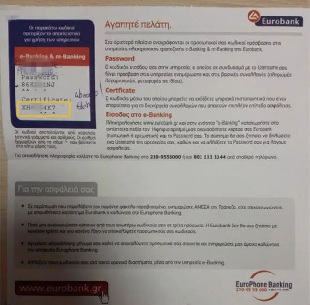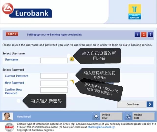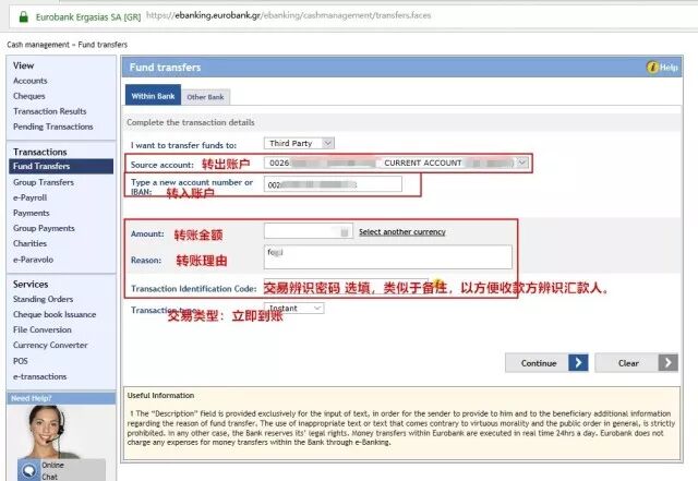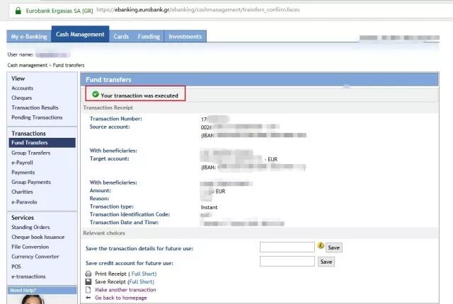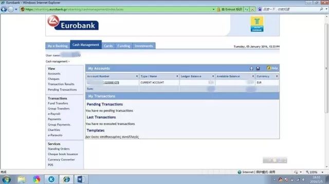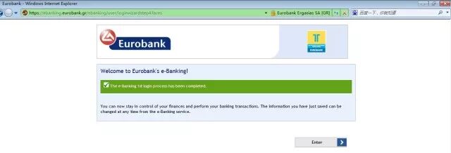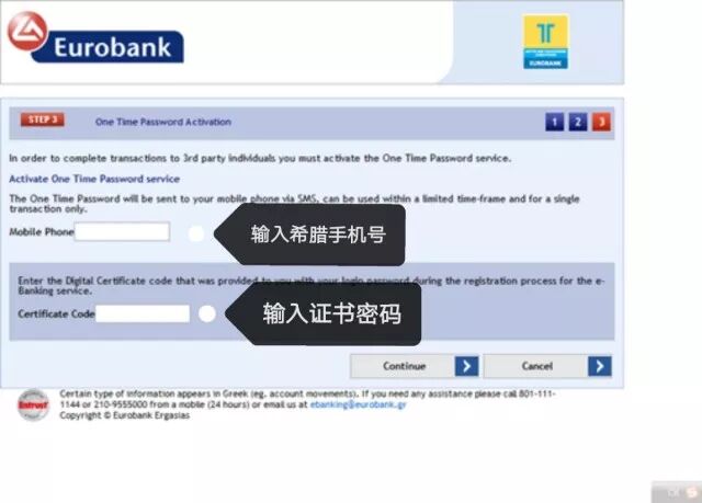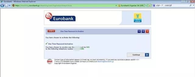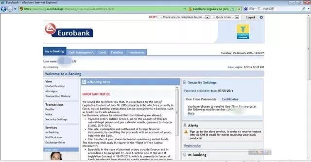 如何开通网银? 开通网银需要投资者亲自入境,开户无需缴纳费用。 开通网银需要携带以下材料 ✔ 护照 ✔ 税号 ✔ 居住地址证明/身份证翻译件 居委会或者物业处开的证明(中英文)必须包括投资者姓名、护照号、详细居住地址,并有提供机构的中英文名称和盖章。 ✔ 投资者的希腊手机号及通信运营商的证明 投资者可以在希腊当地办理手机号。邦派 ▏看这里,教你在希腊高性价比办理电话和网络! 另外,投资者在希腊当地购买电话卡时,必须要求运营商提供证明(证明中明确标示投资者的姓名、护照号及手机号码)。 ✔ 工作证明(中英文 ) 整个开通流程是这样的 ➡ 投资者开通希腊手机号码,用于接收密码提示 ➡ 开通网银时,银行会给投资者一张密码纸,投资者收到密码提示后,在密码纸上找到对应数字,即为网银的初始密码 网银开通成功后,需登录激活后方可使用。 那么,该如何激活网银呢? 网上登陆激活 1 使用 Windows 系统自带的 IE 浏览器,登陆https://www.eurobank.gr 2 点击 E-banking,进入登录界面 3 点击“英国国旗”图标, 可将语言更换为英语 4 输入Username(用户名)和Password (密码) 在Username(用户名)一栏输入银行卡正面的 16 位数字。 在Password(密码)一栏输入密码纸上的字母数字组合。 务必注意 希腊语中,字母 O和 数字 0 等容易混淆。 因此,字母数字组合中,数字下面都有“∧”符号,如果没有则为字母。 如果连续输错密码3次,账户会被锁定。 如需解锁,请拨打银行卡后面的电话,提供银行卡号、开户名、开户主父亲的名字,以及 Eurobank 电话密码的几位数字,工作人员将在电话中直接帮助解锁。 5 点击(注册) Login,进入以下页面 首次登陆网上银行,需要经过以下三步 Useful information regarding transactions 确认相关条款 勾选三个方框,代表已经阅读、知悉并同意所有条款,以后登陆时将不再显示此信息。 勾选后点击右下角 Continue(继续)。 Setting up your e-Banking login credentials 重置网银密码 输入之后点击Continue(继续) One Time Password Activation (optional) 首次登陆激活 有些人可能会找不到证书密码。 注意:证书密码就在开户时银行给的文件第二页。 此时,再次点击continue(继续),手机就会收到信息验证码。 输入验证码后,恭喜你,已经完成首次登陆啦! 6 点击 Enter,再次进入帐户 激活网银后,大多数投资者最常用到的就是查询余额和转账功能。 Eurobank 网银查询余额流程 登录网银 ➡ 点击cash management(基金管理) Eurobank 网银转账流程 1 登录网银 2 选择cash management(基金管理) ➡ fund transfers(转账) ➡ 选择within bank(同一银行)或者other bank(其他银行) ➡ 选择third party(转账给第三方账户) 3 填写转账信息 4 确认交易信息并进行手机验证 确认交易信息无误后,输入手机接收到的验证码,点击 confirm (继续)进入下一页。 5 转账成功后,显示最终的交易信息。