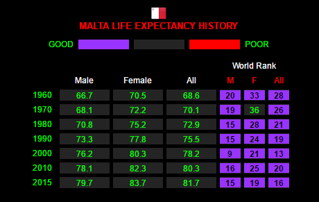 马耳他的男性平均寿命是79.7,女性是83.7,全国范围内平均寿命81.7,位列全球第16位;超过欧洲男性平均寿命75岁,女性81岁的水平。