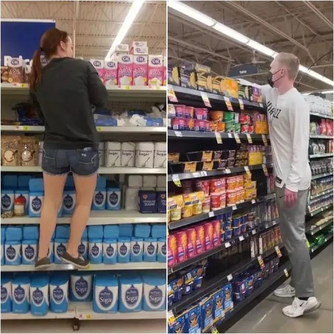 逛超市就更难了,很多食品是真的「高不可攀」,没点臂力很难将他们拿下。